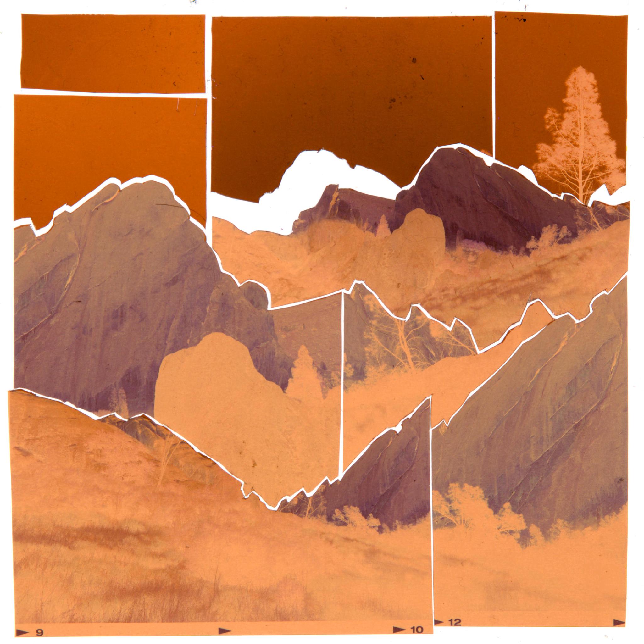 This 4x4" constructed negative film mosaic features Pinnacles National Park on November 8th, 2024, exposed with a Pentax 6x7 camera and 55mm lens on four frames of 120 Kodak Portra 800 speed color negative film.