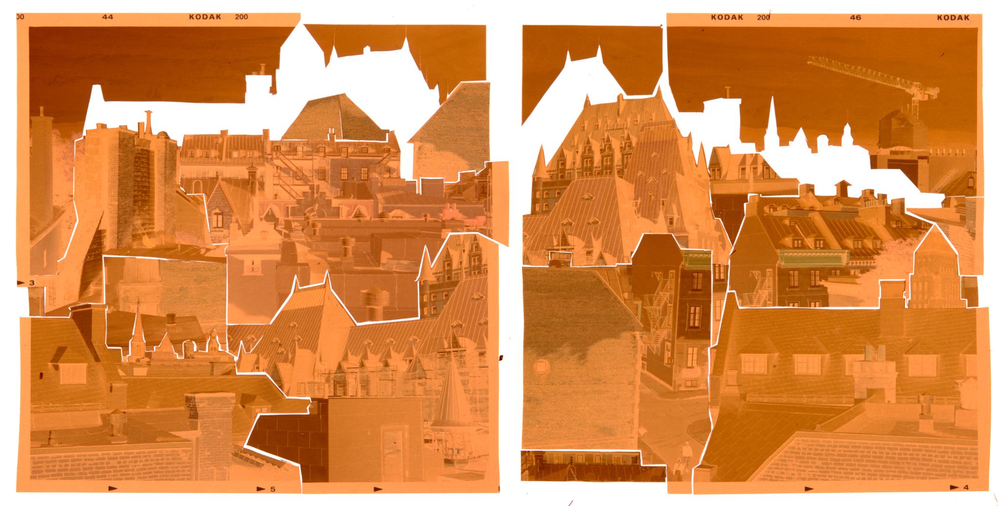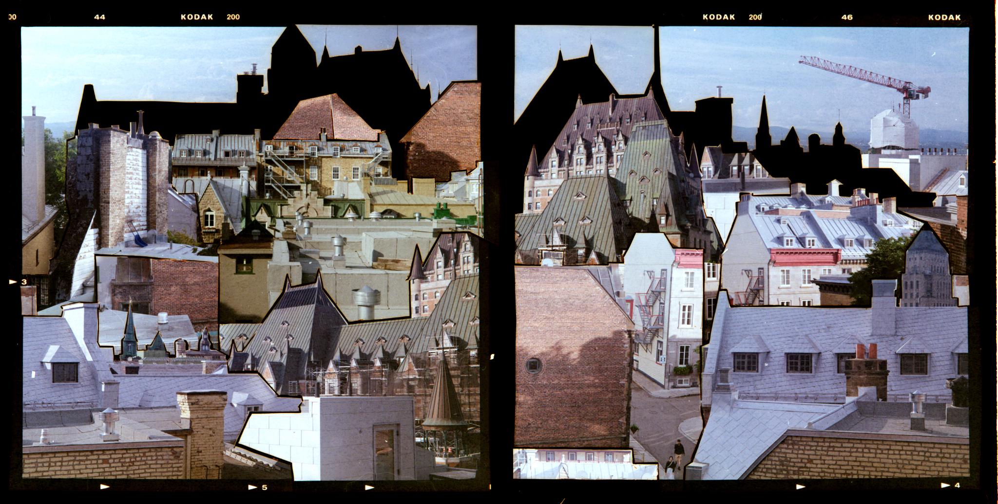 These two 4x4" constructed negative film mosaics were assembled from eight frames of 120 Kodak Gold 200 color negative film, captured with a Pentax 6x7 camera from a rooftop in Québec City.